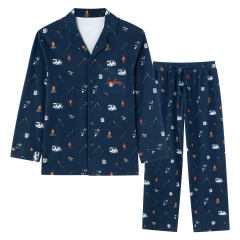 【女款】 条纹开襟翻领印花长袖长裤睡衣套装家居服