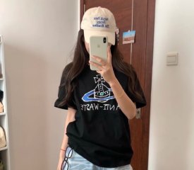 西太后新字母款土星星球印花圆领短袖T恤 男女同款 黑色粉字