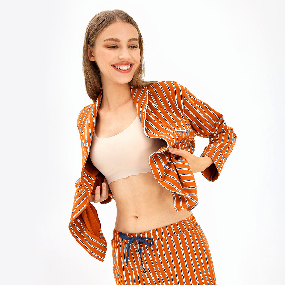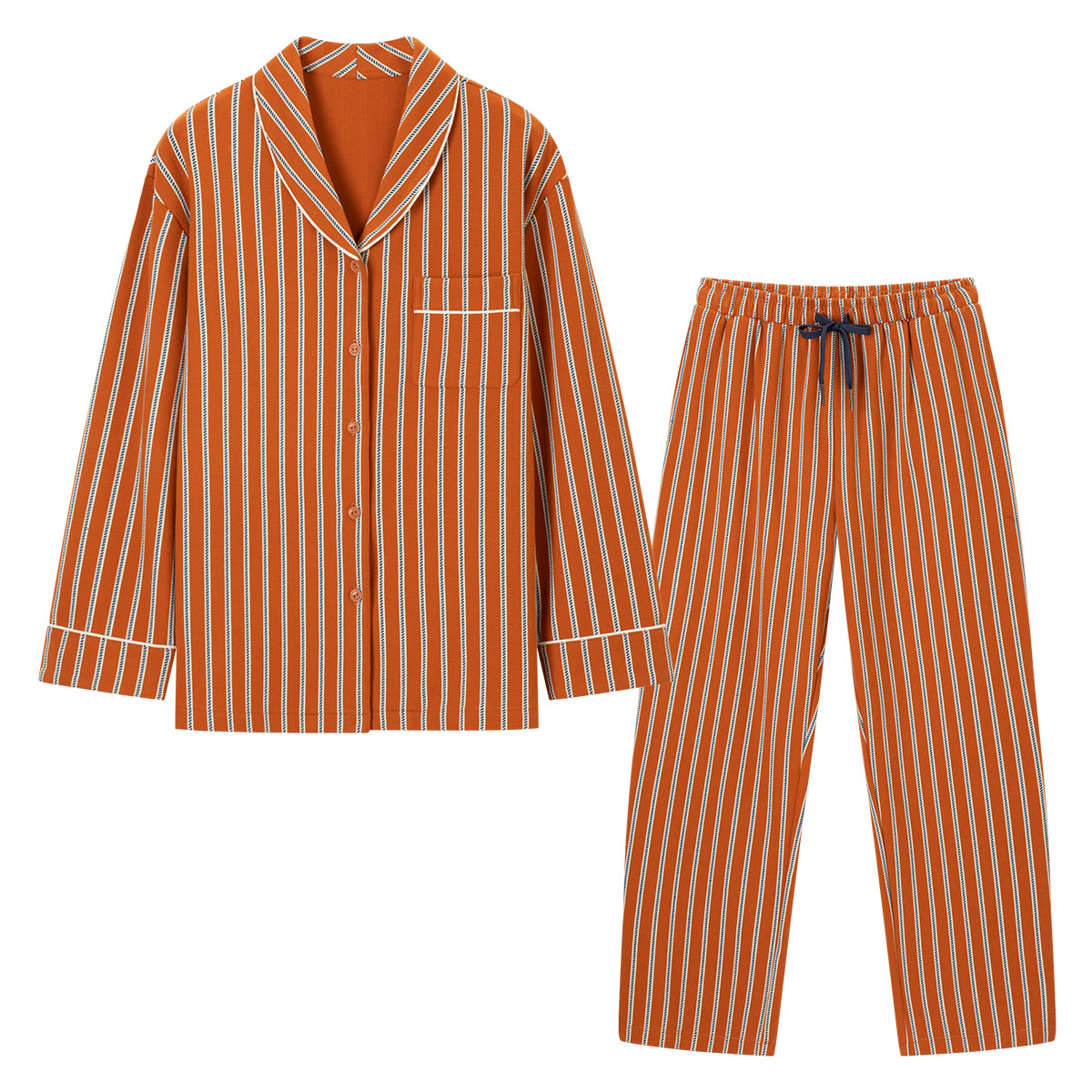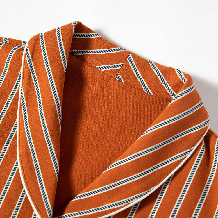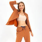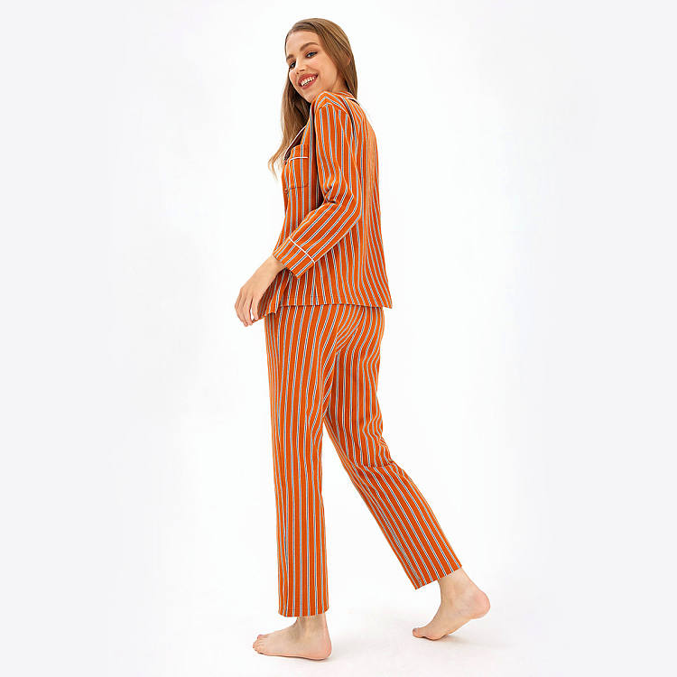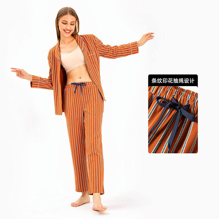 【女款】 条纹开襟翻领印花长袖长裤睡衣套装家居服