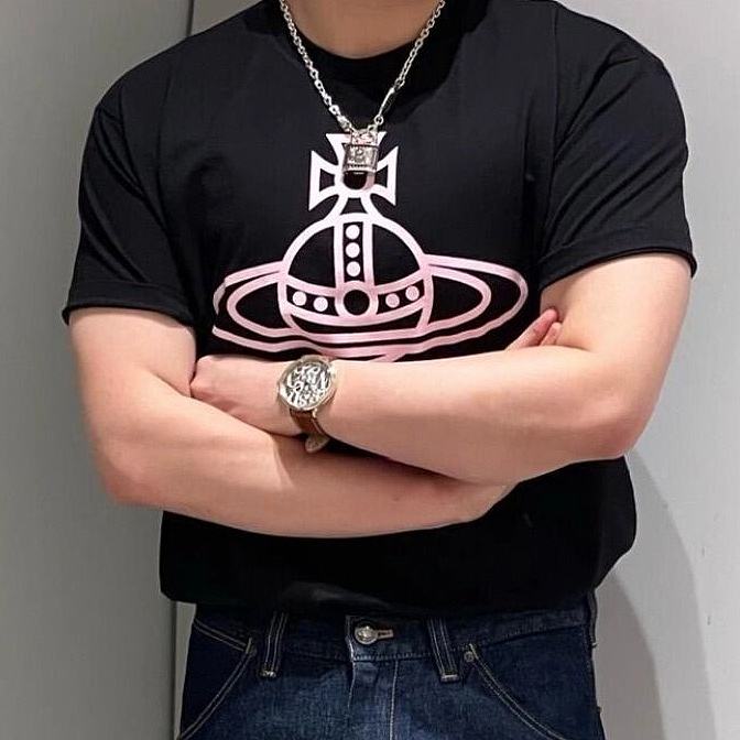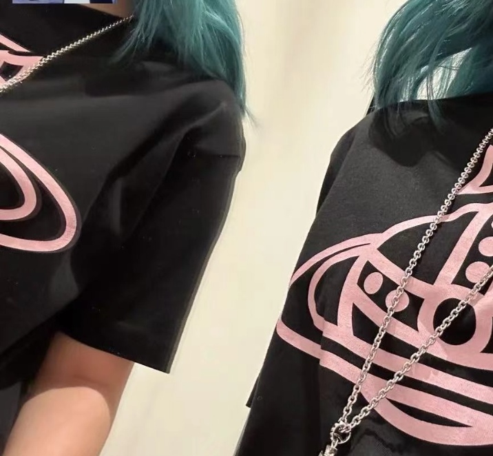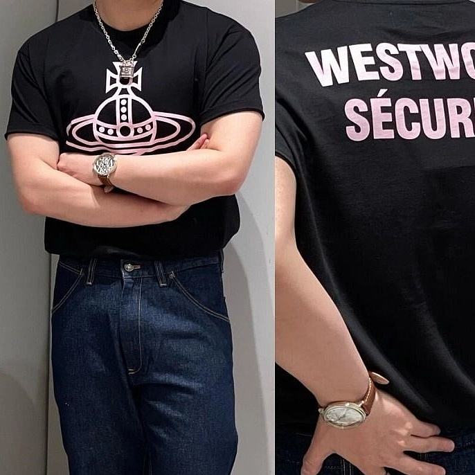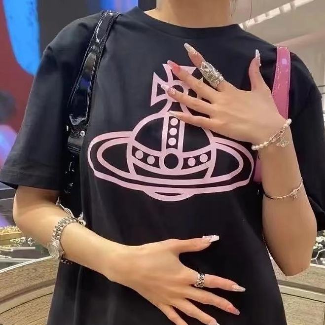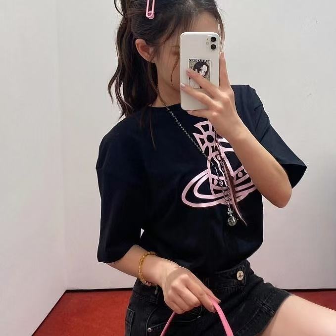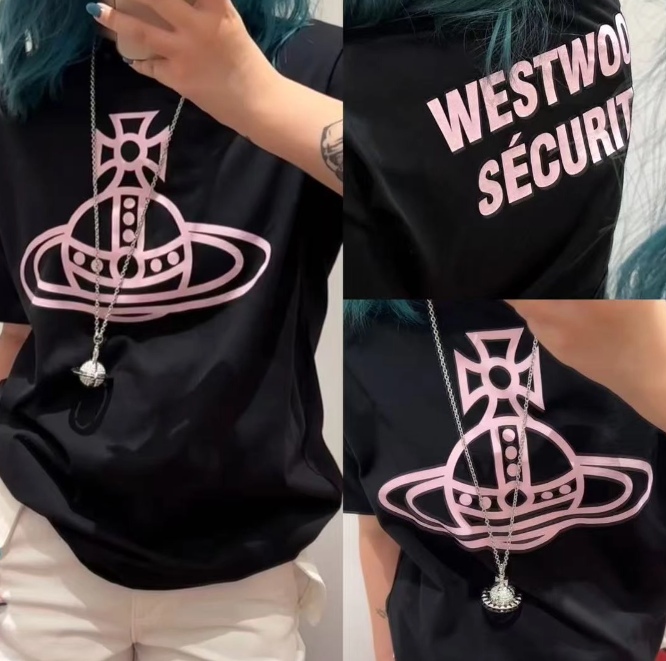 西太后新字母款土星星球印花圆领短袖T恤 男女同款 黑色粉字